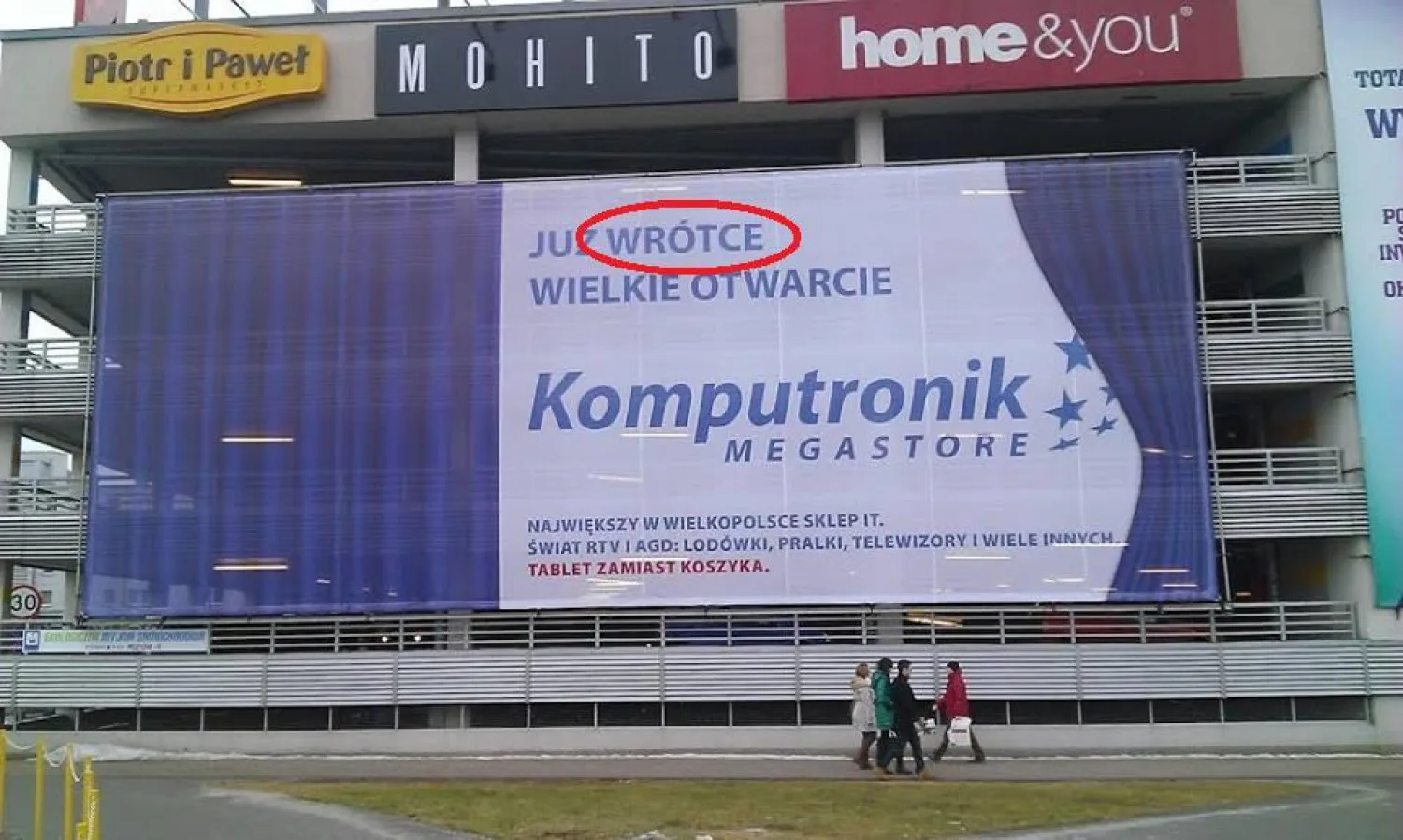 -literówki – można oczywiście zrzucić winę na pośpiech, jednak od czego jest autokorekta? Tekst wrzucony do sieci można w każdej chwili poprawić, gorzej sytuacja się ma, jeżeli taki „byk” trafi na ogromny baner reklamowy.